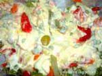 Se cuecen patatas con sal y una hoja de laurel y se trituran bien con un tenedor, añadiendo un poco de agua de la cocción para que queden más tiernas. Se les añade atún, huevos cocidos picados, gambas peladas (previamente cocidas), guisantes (de lata o naturales cocidos), pimientos morrones muy picados, bocas de mar troceadas muy pequeñas y bastante mayonesa. Se mezcla todo, se pone en una fuente, se recubre de mayonesa y se adorna con aceitunas, pimientos morrones, huevo duro, gambas peladas, perejil, etc. |