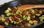 Se pelan y se lavan bien las habas, se ponen en una sartén con aceite caliente, se les echa sal, bastante cebolla tierna picada (puede sustituirse por ajos tiernos) y, si se quiere, un picadillo de jamón, se tapan y se dejan freír a fuego muy lento hasta que estén fritas. Es muy importante que las habas estén frescas y tiernas. |