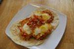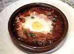 En una sartén se fríe una cebolla picada, unos doscientos gramos de carne picada, picadillo de jamón y rodajas de chorizo. Cuando está todo frito se le añade una botella o lata de tomate natural, se pone bien de sal y se le añade un poco de azúcar y se deja cocer en la misma sartén hasta que se consume el tomate. La salsa anterior se vuelca en una fuente de horno, se le añade una lata de guisantes (o guisantes congelados previamente cocidos), se le parten los huevos necesarios (uno por ración) con un poco de sal, se le ponen unos pimientos morrones y se cuajan en el horno ya caliente. |