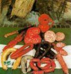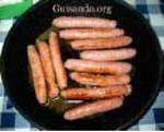 En una perola se echa aceite, una cebolla picada, un tomate rojo picado, dos o tres dientes de ajo partidos, una hoja de laurel, un pimiento seco, pimienta entera, colorante, un vasito de vino blanco y otro de agua y se deja cocer unos veinte minutos. A continuación, se le añaden salchichas de Frankfurt y se dejan cocer unos cinco minutos, hasta que quede en la salsa, procurando que las salchichas queden tiernas y no se rompan. |