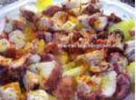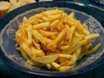 Se fríen unas patatas a lo pobre( partidas redondas, muy finas y fritas en abundante aceite a fuego lento). Cuando se van a apartar se le añade un majado preparado con dos dientes de ajo, una cucharita de pimentón, unos cominos y un poquito de vinagre. |