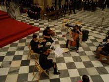 Siguiendo textos literarios cercanos a la época del escultor, este año el autor elegido para resonar entre los muros de tan ilustre marco fue el poeta madrileño Francisco de Quevedo, uno de los grandes escritores de nuestra literatura, cuya figura sorprende todavía por la inmensidad de su talento poético y el dominio tan preciso de la palabra. El recitado, que sonó con fuerza entre los muros de tan singular enclave, corrió a cargo de Jairo García Jaramillo, presente en las otras ocasiones, y de la profesora de Lengua y Literatura del centro Dolores María Belmonte García. Junto a ellos, poniendo el imprescindible acompañamiento musical estuvieron, como en ocasiones anteriores, un Cuarteto de Cuerda de alumnos del Conservatorio Profesional de Música “José Salinas” y el Coro “Juan Hernández”. Como novedad, este año actuó el Grupo “Academy Ensemble”, quinteto de metal de alumnos y profesores del Conservatorio de nuestra vecina ciudad de Guadix, acompañados por un joven organista. Su actuación fue muy celebrada por el público asistente. Es de destacar que varios de los músicos que actuaban son o han sido alumnos del centro bastetano. El repertorio escogido para esta ocasión, impecablemente ejecutado, giró en torno a Mozart, Burgoyne, Häendel, Bach, Clarke e incluso la famosa banda sonora de la película “La Misión”, lo cual dotó de gran majestuosidad al acto, como viene siendo habitual. La experiencia artística y estética que se vivió durante aproximadamente hora y cuarto, alcanzó el objetivo de ser síntesis entre poesía, música y espacio, a lo que contribuyó la única luz de unas velas, que recreaban un ambiente de época, y la presencia de las dos copias de imágenes de José de Mora que custodia la ciudad, una perteneciente a la Cofradía del Santísimo Cristo de los Méndez y la otra, custodiada por la Cofradía del Silencio de Nuestra Señora de los Dolores. También este año el público alabó la puesta en escena que se hizo dentro de la Colegiata, agradeciendo los organizadores a Emilio Robles y a Antonio Utrera su ayuda en la preparación estética del evento. La acogida de público refrendó una vez más el éxito de la iniciativa, dejando un estupendo sabor de boca y ganas de que se repita cada año, pues sin duda el Homenaje puede considerarse ya, después de cinco años consecutivos, uno de los principales acontecimientos que se realizan en la primavera cultural bastetana. |