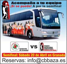 El SDI Baloncesto Baza anima a los aficionados bastetanos a que les acompañen en el primer encuentro de la semifinal y organizan viaje a Granada para ellos. El próximo sábado 20 de abril, a las 19,00 horas, se va a disputar, en el Pabellón El Veleta de Granada, el encuentro que enfrentará al Segura Desarrollos Industriales Baza y al Tourapp Fundación CB Granada, en partido de ida de las semifinales por el ascenso a liga EBA. |