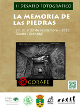 "La memoria de las piedras" será el II Desafío Fotográfico de Gorafe 2013. Al Andalus Photo Tour organiza el II Desafío Fotográfico Gorafe 2013 “La Memoria de las Piedras”, patrocinado por el Excmo. Ayuntamiento de Gorafe y con la colaboración de Homofotograficus.com, la asociación Proyecto Sierra de Baza y el Balneario de Alicún. Estas entidades quieren ofrecer a la comunidad fotográfica un concurso diferente, un desafío en el cual el participante se enfrentará a diferentes retos con su cámara de fotos, en busca de los objetivos fotográficos. En esta segunda edición podrán participar tanto adultos como jóvenes mayores de 10 años, quienes tras haberse inscrito, tendrán la oportunidad de desarrollar su capacidad técnica, creativa y de orientación a lo largo de un fin de semana, primero de la estación otoñal. Este nuevo desafío se desarrollará durante el fin de semana del 20 al 22 de septiembre en Gorafe. Durante la tarde del viernes tendrá lugar –en el Centro de Interpretación Megalítico (CIM)- la presentación del concurso, será entonces cuando se den a conocer los objetivos a fotografiar, así como sus respectivas puntuaciones; también se entregará la documentación necesaria para realización de los objetivos. |