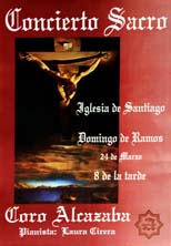 Esta tarde, a las ocho, Concierto Sacro del Coro Alcazaba en la iglesia de Santiago. Constituye ya una larga tradición el hecho de que corresponde al coro “Alcazaba” la apertura e inauguración de la Semana Santa en Baza. Hoy, domingo 24 de marzo, de Ramos, ofrecerá una nueva edición de su Concierto Sacro. Será, como de costumbre, en la iglesia de Santiago a las 8 de la tarde, tras la misa. A través de las obras de diversos compositores clásicos, la mayoría de los siglos XVIII y XIX, el coro efectuará un amplio recorrido por la Pasión, Muerte y Resurrección de Nuestro Señor Jesucristo. Se trata de un ambicioso y extenso Concierto, que esta prestigiosa y veterana agrupación coral bastetana convertirá sin duda en otra memorable velada, que se desarrollará conforme al siguiente repertorio: |