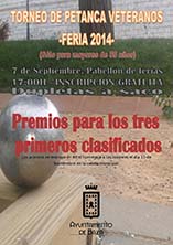 Día 7 septiembre, domingo Hermandad de Nuestra Señora de la Piedad. Patrona de Baza 10.00 visita de Cascamorras a los barrios de Baza: 10.00 Torneo de petanca Feria 2014. Pabellón de Ferias. Inscripción a las 09.00 h. Comienzo a las 10.00 h. Organiza Club Petanca Baza. XLIV Trofeo tirada palomas a brazo. Club de tiro baza. Organiza Armería Ruíz 17.00 Torneo de petanca Feria, mayores de 55 años. Pabellón de Ferias. Inscripción gratuita. 19.00 a 21.00 Apertura de exposiciones en Casa de la Cultura. Certámenes de pintura y fotografía “Dama de Baza”. Permanecerán abiertas durante toda la Feria 21.00 Coronación de las reinas infantiles 2014. En la Caseta Municipal 22.00 Pregón de Feria y Fiestas 2014, en la caseta municipal, a cargo de Dª Carmen Espín Quirante. 22.30 Presentación de las damas y elección de la reina de las Fiestas 2014. Caseta Municipal. 24.00 Gran velada amenizada por Orquesta Cristal y Década en vivo. Caseta Municipal |