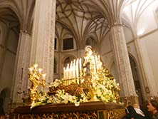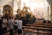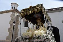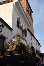 | Allí, la Hermana Mayor dirige el rezo de un padrenuestro, recuerda a los que no están presentes, y se procede a despojar el trono de sus flores, siguiendo una costumbre de muchos años ya, en la que los cofrades y files se llevan pequeños ramilletes florales que, en muchos casos acabarán en el Copetín, junto a aquellos que no podrán salir con Ella nunca más. | ||||