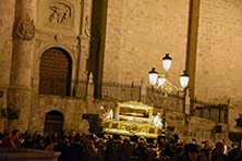 | La puntualidad sigue siendo santo y seña en esta salida y, coincidiendo con la primera campanada del reloj de la torre eclesial, el portón hace chirriar sus bisagras para dar paso a la cruz de guía que anuncia el cortejo que, en un momento, se planta en la bajada a la Plaza Mayor y asiste a una espectacular salida en la que solo se escucha el rachear de las zapatillas de los costaleros y la voz serena de su capataz, ojos por los que ven todos ellos para mimar el caminar de la Virgen. | ||||