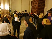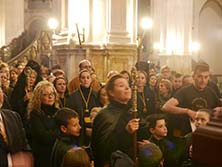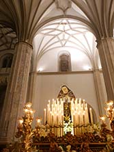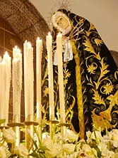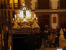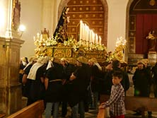 Todo empieza una hora antes, cuando los penitentes se reúnen en la Iglesia de los Dolores, la sede de su Titular, donde se recogen faroles y enseres para, a cara descubierta, dirigirse hacia la Iglesia Mayor, donde la Virgen de los Dolores espera en su torno, remodelado para este año, con su candelería encendida tras la que emerge la bella imagen que es reproducción escultórica de la primitiva que realizara el escultor e imaginero bastetano José de Mora, ataviada con un manto de terciopelo negro, bordado en oro, cuyo origen se remonta al siglo XVIII. Allí están también varias docenas de costaleras que preparan sus fajas y costales para sacar a la Dolorosa como solo ellos saben y como solo Ella sale en nuestra ciudad. La actividad se centra en organizar la cuadrilla en la que este año parece haber más gente que nunca y en la que se siguen viendo caras muy veteranas, junto a otras de jóvenes bastetanos que comienzan a acercarse a esta Virgen del Silencio que tantas sensaciones provoca entre todos. |