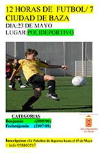 Abierto el plazo de inscripciones para participar en las 12 Horas de Fútbol 7 y 12 Horas de Voleibol. Hasta el próximo 15de mayo se pueden realizar las inscripciones para participar en las 12 Horas de Fútbol 7 en las categorías prebenjamín y benjamín, que se celebrará el próximo 23 de mayo en el campo de césped artificial del nuevo polideportivo municipal. |