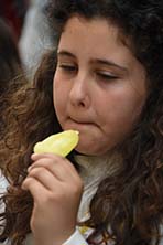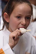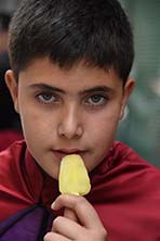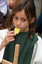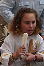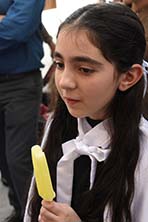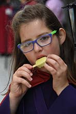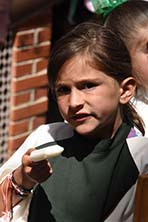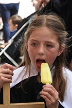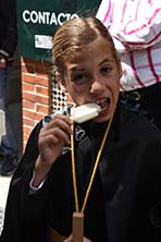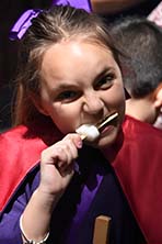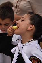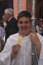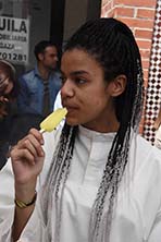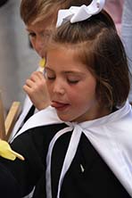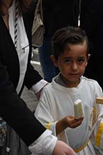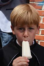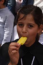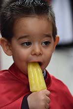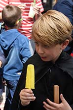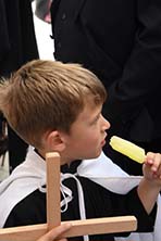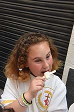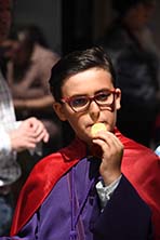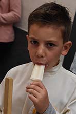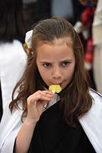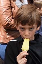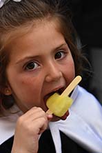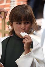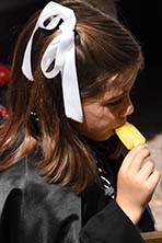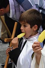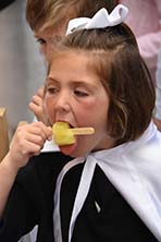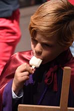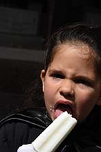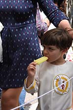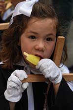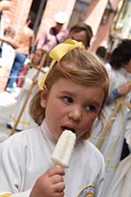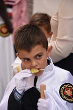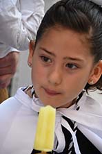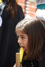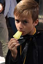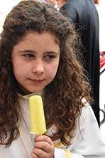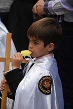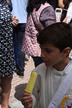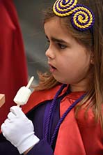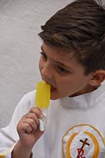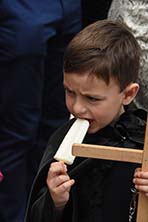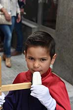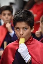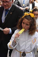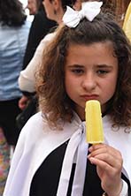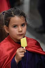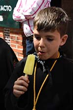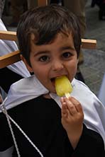 La procesión del Resucitado es conocida en Baza como la de la "Cofradía del polo". ¿Por qué será? Pues baste con echar un vistazo a la galería de imágenes que ofrecemos a continuación y que nace por una iniciativa, que lleva ya muchos años en marcha, y que surgió desde la Heladería de "Los Valencianos". Así, cada año, cuando finalizan los actos ante la Tribuna Oficial, en la Plaza Mayor, y la procesión retoma el itinerario camino del Templo de la Piedad, la Heladería pone en manos de la Junta de Gobierno de la cofradía un buen número de cajas con sus apreciados polos y niños y niñas van escogiendo el sabor que más les gusta, tras lo que con la cruz en una mano y el polo en la otra, la procesión reanuda su itinerario habitual. A continuación una muestra de cómo se toman este asunto los nazarenos, muestra en la que no están todos pero sí aquellos que nos ha dado tiempo a fotografiar en plena degustación: |