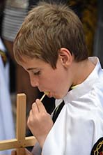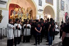 El bullicio se dejaba notar en el Templo de la Piedad hasta que se logró el silencio que dejaba escuchar la voz del párroco y consiliario, el P. Emilio Fernández, uno de los artífices del gran y buen trabajo que se está realizando en esta parroquia, quien dedicaba unas bonitas palabras alusivas a la festividad que se conmemoraba y dirigía la oración en la que le acompañaron todos los presentes en el templo. Después fue el Hermano Mayor quien daba las últimas consignas y ordenaba que se echase a andar la Cruz de Guía. |
