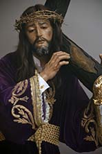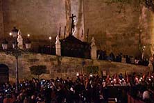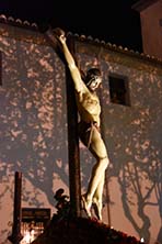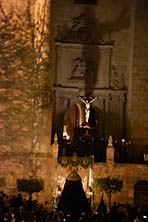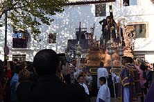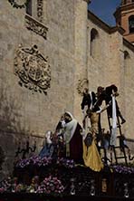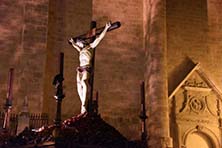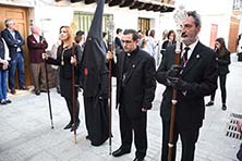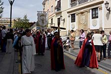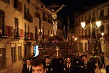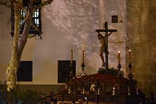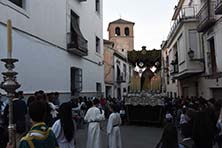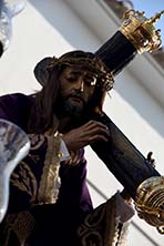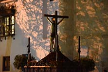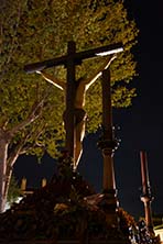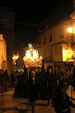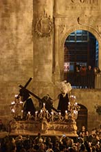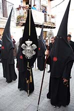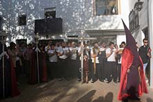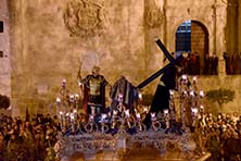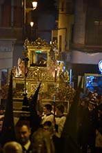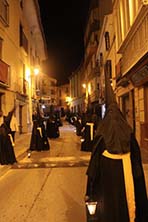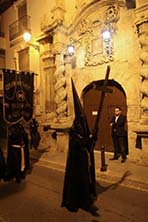 Costaleros de diferentes cofradías se organizan para llevar sobre sus hombros este paso que desfila acompañado por música de capilla y por nazarenos de los que un grupo porta cruces de madera y otro lo hace llevando enormes cirios, siendo característico el fajín de su hábito y, sobre todo, el silencio absoluto y el gran recogimiento de todos sus componentes. |