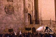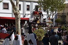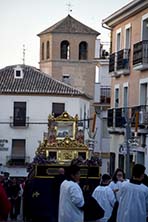 La plaza de la Cava Alta se encontraba a rebosar cuando, procedentes de la Iglesia de San Juan, llegaban los penitentes y la banda granadina de la Agrupación Musical Dulce Nombre de Jesús, tras lo que uno de los nazarenos golpeaba la puerta de la Casa de Hermandad que, tras abrirse de par en par, dejó ver el paso del Nazareno, bellamente adornado y dispuesto para recorrer las calles de Baza. |