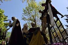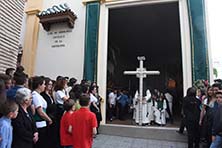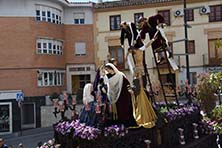 Eran las nueve de la mañana, media hora más tarde que en años anteriores, cuando se abrían las puertas de su sede canónica, la Iglesia de Santiago, para dar inicio a una procesión que marca la mañana del Viernes Santo bastetano y en la que procesionan los pasos del Santísimo Cristo del Descendimiento, que sigue incorporando nuevas imágenes, las de Santa María Magdalena y María de Salomé ubicadas junto a Sta. María del Rocío en sus Misterios Dolorosos, que fueron bendecidas el pasado sábado de pasión y a las que también acompaña la incorporación del año anterior, San Juan Evangelista, todas ellas obra del escultor e imaginero malagueño Juan Vega. Destacar que la cuadrilla de costaleras que porta este paso celebra este año su trigésimo aniversario ininterrumpido. |