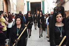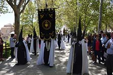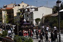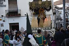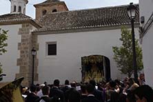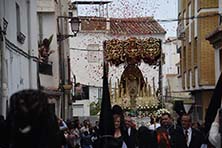 Junto al paso del Cristo, la Banda de Tambores y Cornetas La Unión de Baena, con un sonido muy bueno y un programa variado y estudiado a lo largo de todo el recorrido. A la cabeza, y tras la Cruz de Guía, un numeroso grupo de niños y niñas que siguen dejando ver la excelente cantera que esta cofradía tiene y que se deja ver en cada una de sus procesiones. Después, la Virgen de los Dolores, portada por los costaleros que ocupan sus trabajaderas, luciendo el palio que tiene como motivo principal a la patrona bastetana, la Virgen de la Piedad, y con un adorno floral muy fino y de exquisito gusto. Además del nutrido grupo de penitentes que la acompañan, un buen número de mantillas que nos hubiera gustado ver hasta el final, mientras para la Dolorosa sonaba la música de la Banda Municipal accitana, que incluyó entre su programa la composición "Orgullo Santiaguero". |