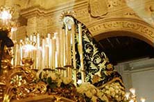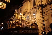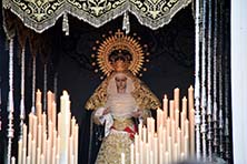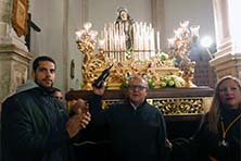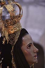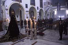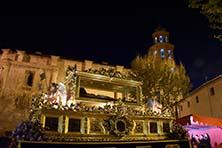 En el principal templo bastetano la actividad es frenética en los costaleros que han ultimado medidas, preparan sus costales y se disponen a cargar sobre sí a la Dolorosa, en una noche tan significativa como esta. Coincidiendo con el primer sonido que marca las doce de la noche en el reloj, las puertas del templo se abren y aparece la cruz de guía que precederá este cortejo en el que la música la ponen dos roncos tambores que silencian sus sonidos en cada parada, mientras que los penitentes se giran a mirar a su Virgen y portan faroles encendidos en la mano. Encendida y resplandeciente la candelería de un paso que este año dejaba ver nuevas y profundas obras de restauración y que lucía un precioso adorno floral, sencillo pero de mucha belleza y que realzaba la imagen de la Dolorosa que luce los siete puñales sobre su pecho. |