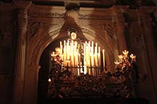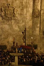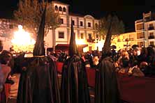 Mucha gente en la Plaza Mayor, en una noche de climatología excelente, como toda la Semana Santa, y con un recorrido en el que el público dejaba ver su admiración al paso de este cortejo, con la única excepción de los aledaños a las zonas de ocio en los que el bullicio se deja notar en extremo, aunque nada inmuta a un cortejo que continúa con su solemnidad y con la seriedad y gran estilo que acumula desde hace ya muchos años. A destacar también la interpretación de varias saetas a lo largo del recorrido, con una excelente ejecución de Roberto González, de las que nos atrevemos a destacar la que cantó en una calle Ancha que sigue siendo lugar emblemático del recorrido de esta estación de penitencia y en la que el público, que no aplaude en esta procesión, dejaba ver la admiración a tan sentidos momentos, simplemente, con la expresión de sus rostros. |