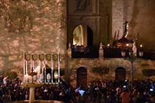 La salida y el encuentro con la Esperanza volvieron a ser el punto culminante en la procesión del Cristo de los Méndez. La Plaza Mayor bastetana se oscurece, se apagan las faroles y se encienden las antorchas que jalonan la rampa que conduce desde la Iglesia Mayor a la principal plaza bastetana, en una noche de Jueves Santo en la que no cabe un alfiler en la Plaza Mayor. Es, sin duda, el momento de mayor presencia y al que acude más público de toda la Semana Santa de nuestra ciudad. |