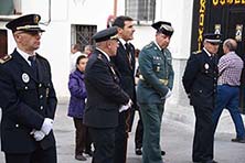 Circunstancias estas que hacen que este desfile procesional tenga un tono absolutamente sobrio y disciplinado, a la par que elegante, siendo característica destacada de esta procesión el acompañamiento de la Corporación en pleno, junto a autoridades como la Guardia Civil, Policía Armada, Policía Local y Bomberos bastetanos, así como el de una representación de las diferentes Hermandades y Cofradías de nuestra ciudad, todas las cuales van con traje de paisano y portando los cetros con sus correspondientes distintivos y representantes del clero de la ciudad. |