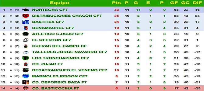 | Trofeo "Construcciones Veneno" de la VI Liga de la As. Dep. de F7 de la Zona Norte tras la jornada 11: | ||||||||||||||||||||||||||||||||||||||||||||||||||||||||||||||||||||||||||||||||||||||||||||||||