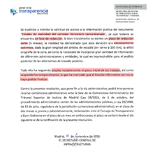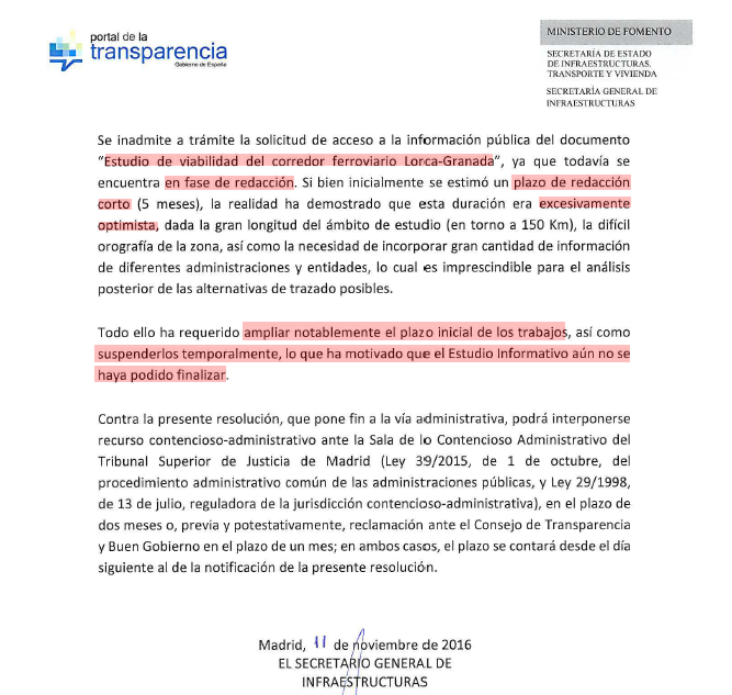 No podemos más que cuestionar la previsión de finalización del estudio durante el presente ejercicio de 2017. Primero, porque el propio Secretario General de Infraestructuras del Ministerio de Fomento aseguraba en noviembre de 2016 (por resolución de consulta del Portal de Transparencia) que la elaboración del documento había sufrido suspensiones, tras haberse ejecutado tan sólo 90.000 euros del total consignado para estos dos últimos años. Y ahora, un trimestre después, desde el Gobierno central se habla de que está “muy avanzado y en fase final”, mensaje que transmitía el subdelegado del Gobierno en Granada a Pedro Fernández (Alcalde del Ayuntamiento de Baza, Portavoz de Diputación de Granada y Secretario de Ordenación del Territorio y Vivienda del PSOE de Andalucía) en su encuentro de este 7 de febrero. |