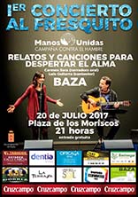 La delegación de Manos Unidas en Baza ofrece hoy un atractivo "Primer concierto al fresquito" en la Plaza de los Moriscos. Con motivo de la campaña 2017 de Manos Unidas, la Delegación de Baza se ha planteado organizar el "Primer concierto al fresquito", que tendrá lugar hoy jueves 20 de julio, a las ocho de la tarde, en la plaza de los Moriscos, popularmente conocida como Plaza de las Tetas. |