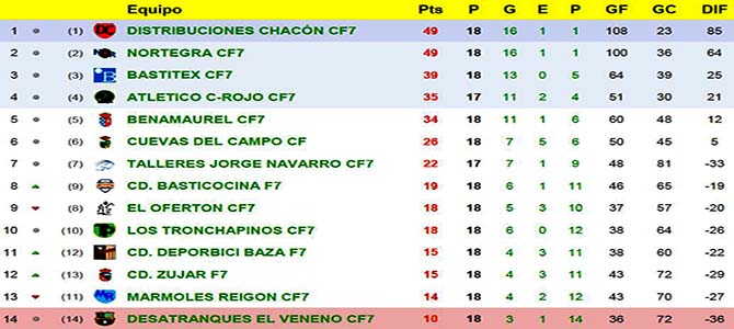 | Trofeo "Construcciones Veneno" de la VI Liga de la As. Dep. de F7 de la Zona Norte tras la jornada 18: | ||||||||||||||||||||||||||||||||||||||||||||||||||||||||||||||||||||||||||||||||||||||||||||||||||||||||||||||