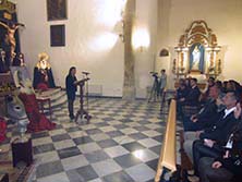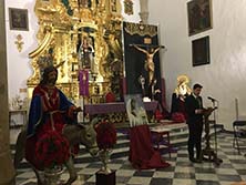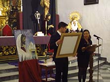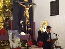 Siguió un momento de agradecimiento con la entrega de tres distinciones para Amador Gallego, el vestidor Juan Carlos Onieva y a Juan Martín Arán, un hermano de los de siempre y que ha procesionado en muchas ocasiones como pertiguero, hasta ser aquejado de una enfermedad de la que se está recuperando y que le hizo recibir el Premio Raúl Soriano que cada año otorga esta cofradía. Tomó después la palabra la Hermana Mayor, Verónica Cruz, para presentar al Pregonero de la Esperanza 2017, su actual compañero en la vida y en la Junta de Gobierno, del que destacó sus valores y su implicación cofrade en general y, de forma especial, con esta Cofradía. El Pregón de José Ramón estuvo precedido por la música de corneta a la que el pregonero ha estado ligado también durante tantos años y que le llevara a ser un integrante destacado en la Banda dela Esperanza que en su día tuvo la Cofradía. Después, en un entreacto del pregón, volvería a tocar de nuevo, acompañado de su hermano Ricardo y de la guitarra de Javier Molina. |
