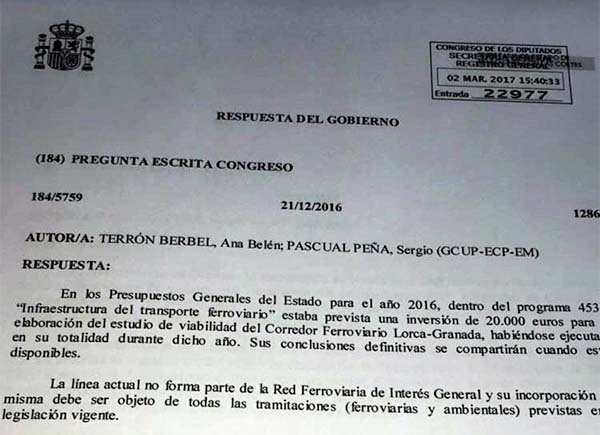 La cortina de humo del gobierno perjudica a comarcas que llevan tres décadas de aislamiento ferroviario, comunicado de Amigos del Ferrocarril Comarca de Baza. Un comunicado que recibíamos en el día de ayer y que reproducimos a continuación, junto a la imagen que lo acompaña: La Asociación de Amigos del Ferrocarril de la Comarca de Baza muestra su decepción con la respuesta por escrito que el Gobierno ha dado a los parlamentarios Ana Terrón y Sergio Pascual (Unidos-Podemos) en su cuestión sobre la reapertura de la línea férrea Guadix Baza Almanzora Lorca, a instancia de este colectivo. |