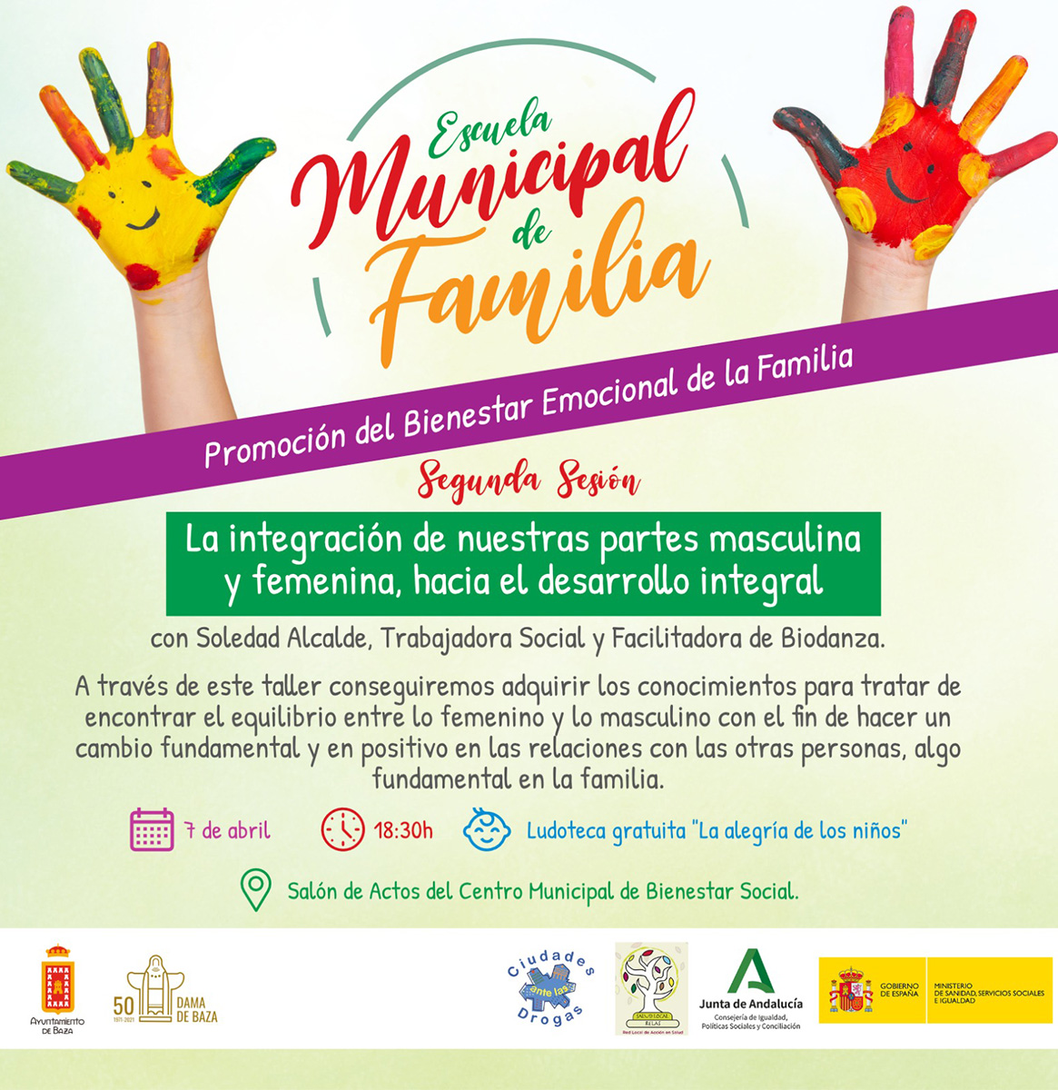 La segunda sesión de la Escuela Municipal de Familia se dedica a la integración de nuestras partes masculina y femenina para un desarrollo integral. La Escuela Municipal de Familia que organiza el Ayuntamiento de Baza a través del área de Bienestar Social, Igualdad, Mujer, Salud, Deporte y Juventud continúa su programación de primavera el próximo 7 de abril con una sesión titulada “La integración de nuestras partes masculina y femenina, hacia el desarrollo integral” que impartirá Soledad Alcalde, trabajadora social y facilitadora de biodanza. La cita es de nuevo a las seis y media de la tarde en el salón de actos del Centro Municipal de Bienestar Social y, para facilitar la asistencia, se contará con servicio de ludoteca gratuita de la mano de “La alegría de los niños”.