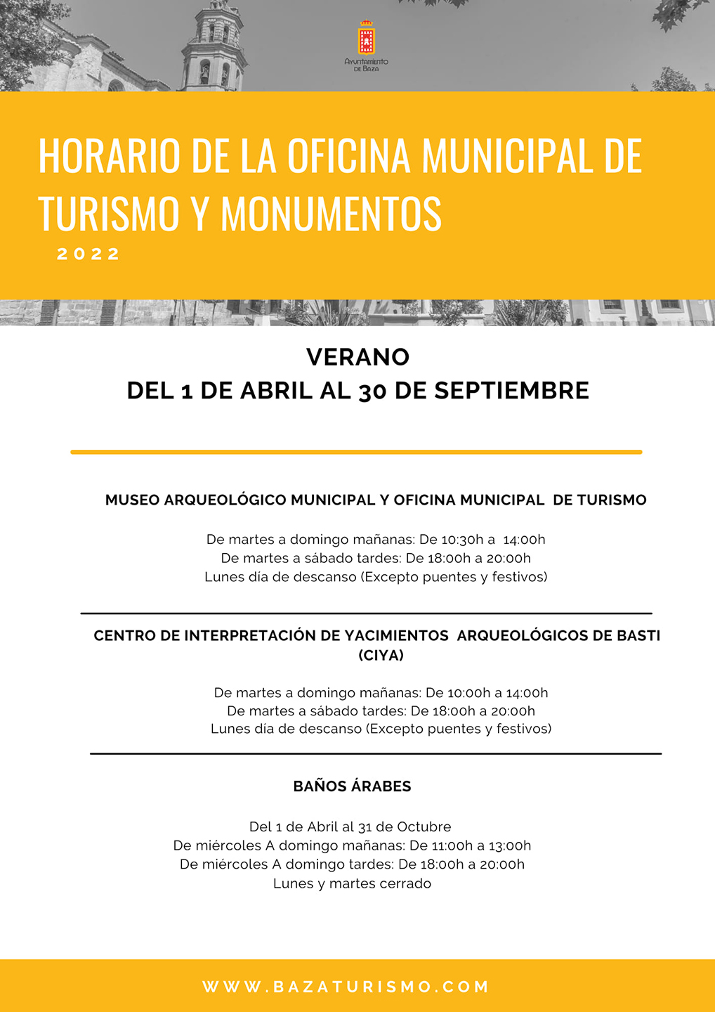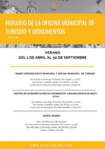 Del 1 de abril al 30 de septiembre, horario de verano en las diferentes dependencias turísticas de Baza. Con el inicio del mes de abril llega el acostumbrado cambio horario en estos servicios, los cuales quedan conforme se indica a continuación: