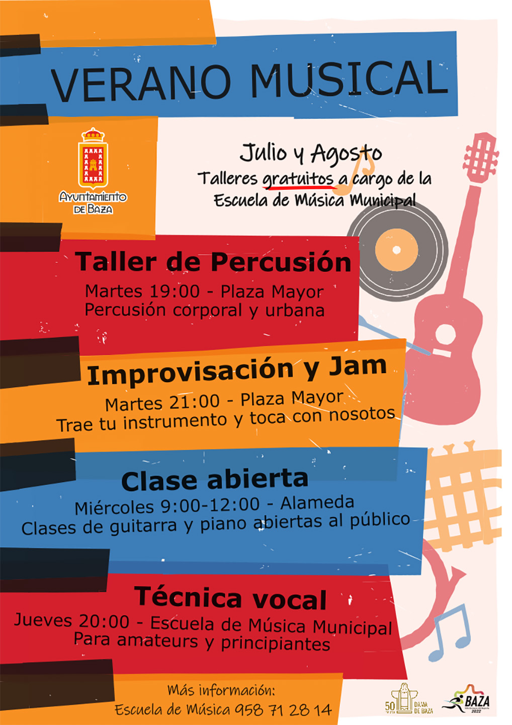 La Escuela de Música Municipal oferta talleres gratuitos de percusión, improvisación y jam, guitarra y piano y técnica vocal. El profesorado de la Escuela de Música Municipal propone una serie de talleres gratuitos durante los meses de julio y agosto que se desarrollarán en Parque Alameda, soportales del museo y en la propia escuela. Para apuntarse tan solo hay que llamar a la Escuela de Música, teléfono 958712814.
