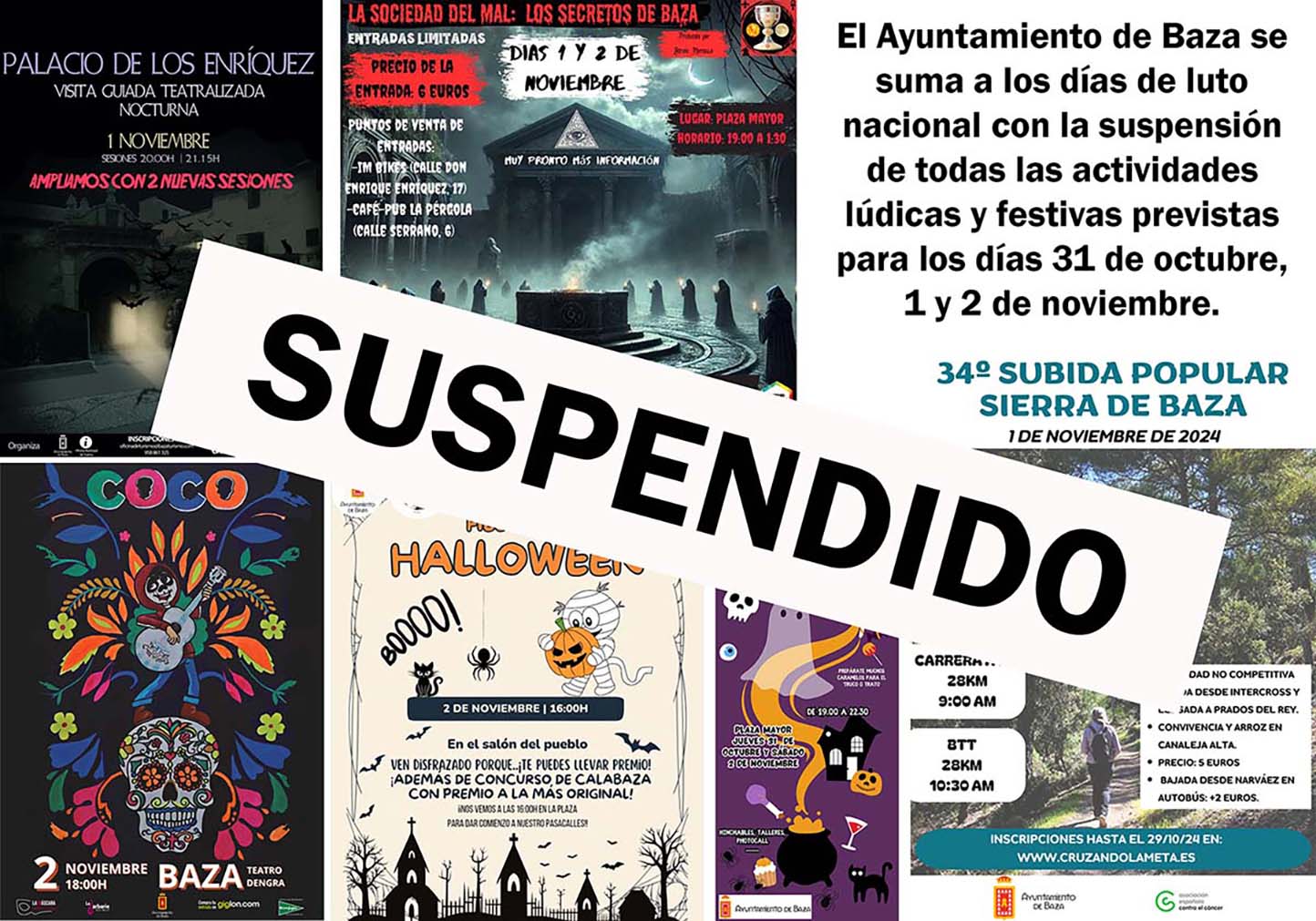 En señal de solidaridad con las víctimas de la DANA que ha afectado y que sigue afectando a nuestro país y por acuerdo unánime de todas las fuerzas políticas que conforman la Corporación Municipal, el Ayuntamiento de Baza ha adoptado la decisión de suspender todos los actos institucionales organizados desde este jueves 31 de octubre hasta el próximo sábado 2 de noviembre de 2024; entre ellos, el pleno ordinario correspondiente al mes de octubre. Igualmente, se ha adoptado la decisión de suspender todas las actividades de carácter festivo y lúdico programadas para dichos días, tanto aquellas que estaban organizadas directamente por el Ayuntamiento de Baza, como aquellas en las que simplemente colaboraba o dependían de alguna instalación o inmueble municipal. Entre ellas se destacan: