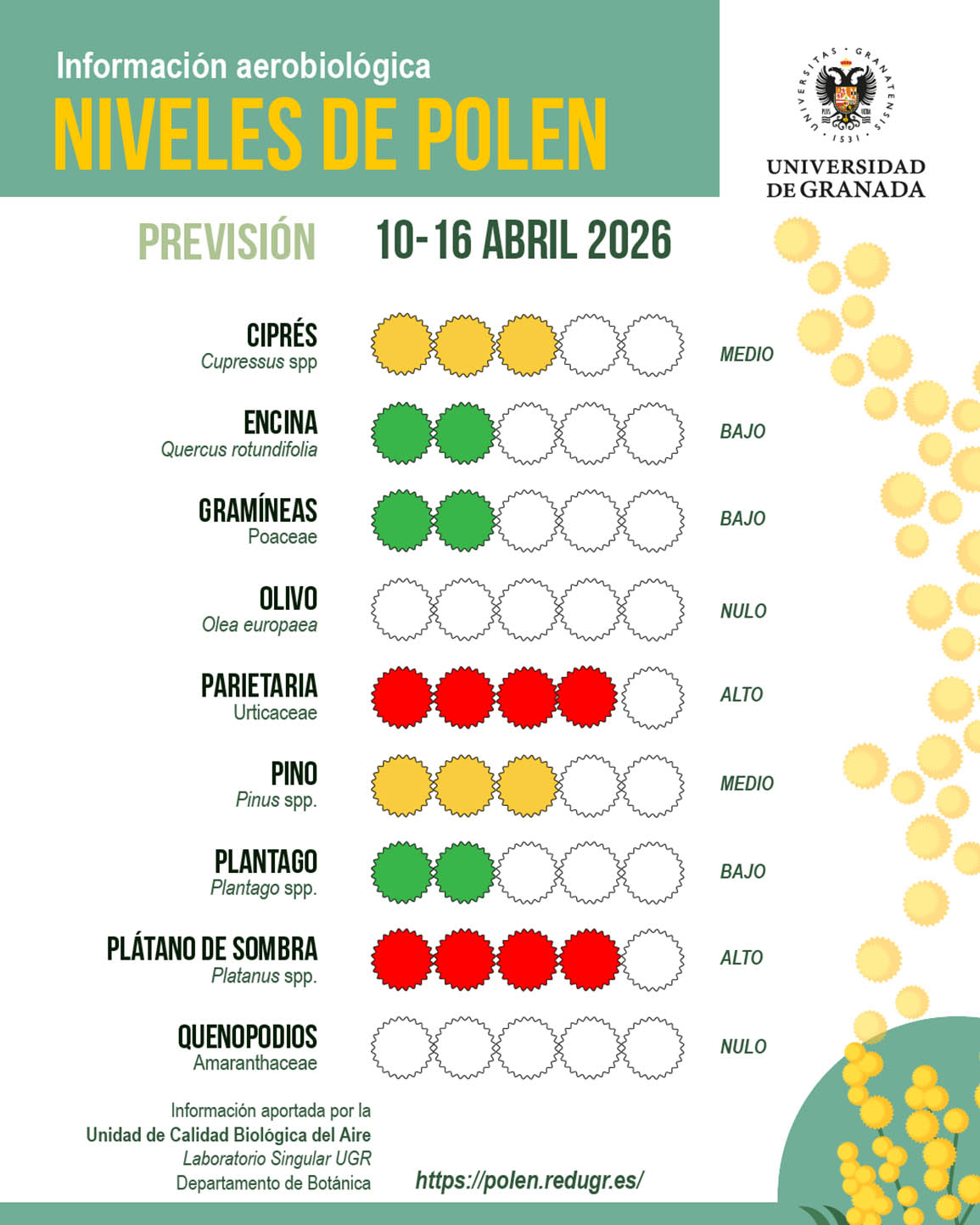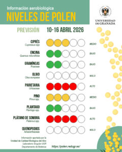 Según la Unidad de Calidad Biológica del Aire de la Universidad de Granada, las altas concentraciones responden principalmente a la floración de especies como los plátanos de sombra y las parietarias, que presentan niveles especialmente altos. A estos se suman los cipreses, con valores moderados, mientras que gramíneas, llantenes, fresnos y otras especies se mantienen en niveles bajos.