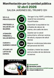 Más de medio centenar de colectivos respaldan la movilización en Granada este domingo en defensa de la sanidad pública, que se desarrollará de forma simultánea en toda Andalucía. La defensa de la sanidad pública volverá a tomar las calles este domingo en Granada con una manifestación convocada por la Mesa en Defensa de la Sanidad Pública, que cuenta con el apoyo de más de cincuenta organizaciones entre asociaciones, sindicatos y formaciones políticas.
