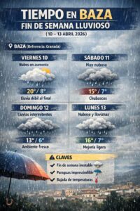 Fin de semana inestable en Baza y su comarca, con lluvias y descenso de temperaturas. La inestabilidad atmosférica marcará el tiempo en Baza durante el fin de semana comprendido entre el viernes 10 y el lunes 13 de abril. Aunque las previsiones detalladas proceden principalmente de la cercana Granada, su comportamiento meteorológico sirve como referencia fiable para el altiplano, donde se espera una evolución muy similar.
