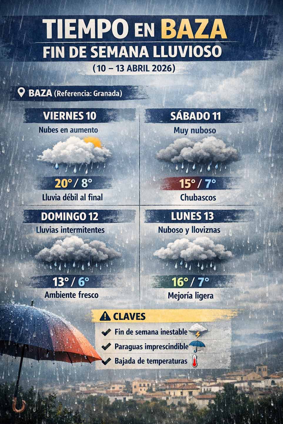 En conjunto, se presenta un fin de semana típicamente primaveral en la comarca de Baza, con tiempo cambiante, lluvias irregulares y un acusado descenso de temperaturas. Un escenario en el que el paraguas se convierte en un elemento imprescindible y en el que habrá que estar atentos a la evolución del cielo en cada momento.