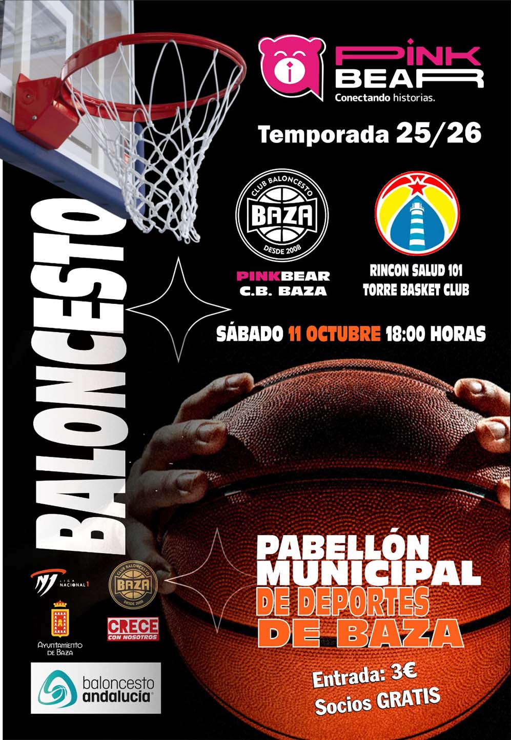 Debut del CB PinkBear Baza en casa este sábado ante un potente Torrebasket. El pabellón bastetano volverá a vibrar con el mejor baloncesto este sábado 11 de octubre a las 18:00 horas, cuando el CB PinkBear Baza dispute su primer partido como local de la temporada. El conjunto bastetano buscará su primera victoria del curso ante un rival exigente, el Torrebasket de Málaga, que llega a la cita tras imponerse con autoridad a Santa Fe por 20 puntos en la jornada inaugural.