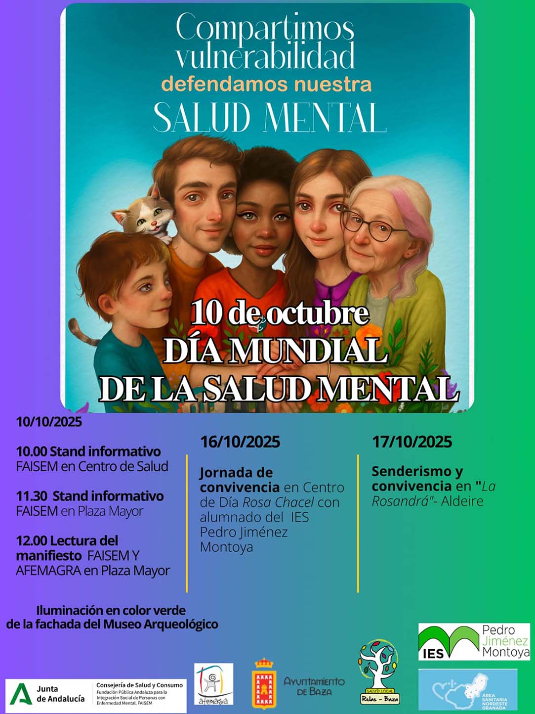 El resto de la programación se mantiene sin cambios. Bajo el lema “Compartimos vulnerabilidad, defendamos nuestra Salud Mental”, la jornada comenzará a las 11:30 horas con diversas actividades abiertas a toda la ciudadanía. El evento está promovido por la Asociación AFEMAGRA–Salud Mental Granada Nordeste y FAISEM, con la colaboración del Ayuntamiento de Baza, la Junta de Andalucía y numerosas entidades locales integradas en el Programa RELAS.