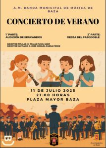 La Banda Municipal de Música de Baza celebra su Concierto de Verano con la clausura del curso de su Escuela de Música. La Asociación Musical Banda Municipal de Música de Baza ofrecerá el próximo jueves 11 de julio, a las 21:00 horas en la Plaza Mayor, su tradicional Concierto de Verano, un evento al aire libre y con entrada gratuita que este año incorpora una significativa novedad: la clausura del curso académico de su Escuela de Música.