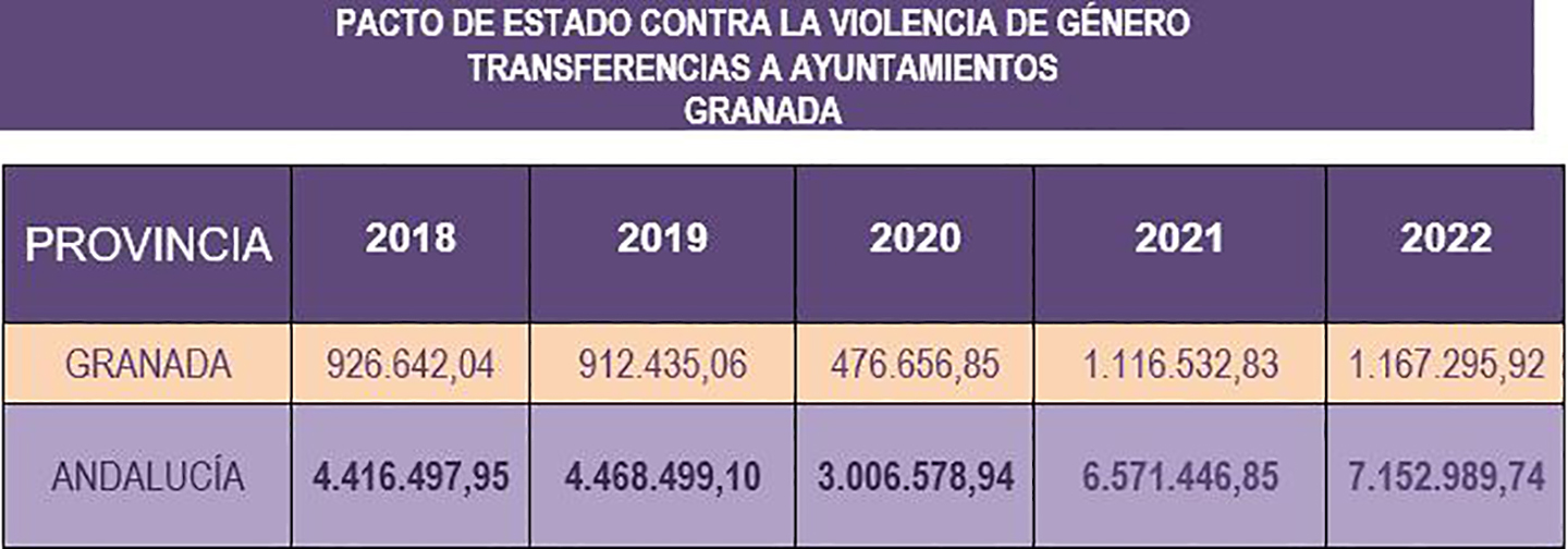 El Gobierno de España transfiere casi 1,2 millones de euros a los municipios de la provincia de Granada para la lucha y erradicación de la violencia machista. El Gobierno de España, a través de la Secretaría de Estado de Igualdad y contra la Violencia de Género, ha aprobado la transferencia de casi 1,2 millones de euros (1.167.295,92€) a los ayuntamientos de la provincia de Granada, para la realización de proyectos y programas que tengan como finalidad el desarrollo de las medidas del Pacto de Estado en materia de violencia de género, aprobado por el Pleno del Congreso de los Diputados en septiembre de 2017.