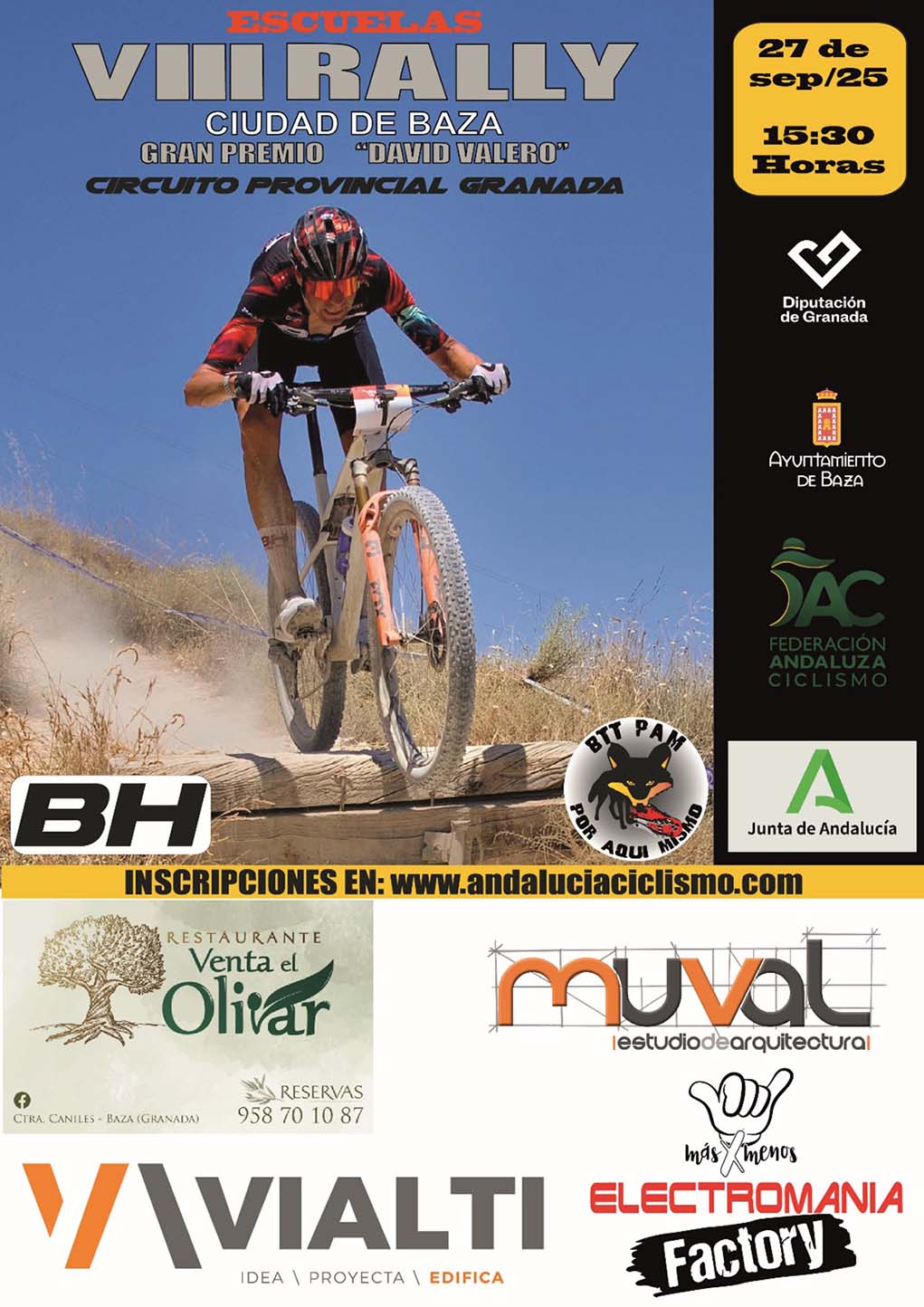 Baza acoge el VIII Rally “Ciudad de Baza – Gran Premio David Valero” el próximo 27 de septiembre. La ciudad de Baza se prepara para recibir este sábado 27 de septiembre la octava edición del Rally “Ciudad de Baza – Gran Premio David Valero”, una cita ya consolidada dentro del calendario ciclista provincial. La prueba, organizada por el club BTT Por Aquí Mismo (CDC PAM) con la colaboración del Ayuntamiento bastetano, la Diputación de Granada, la Junta de Andalucía y la Federación Andaluza de Ciclismo, se disputará en el circuito de montaña “David Valero”, ubicado en la zona de la Fuensanta.