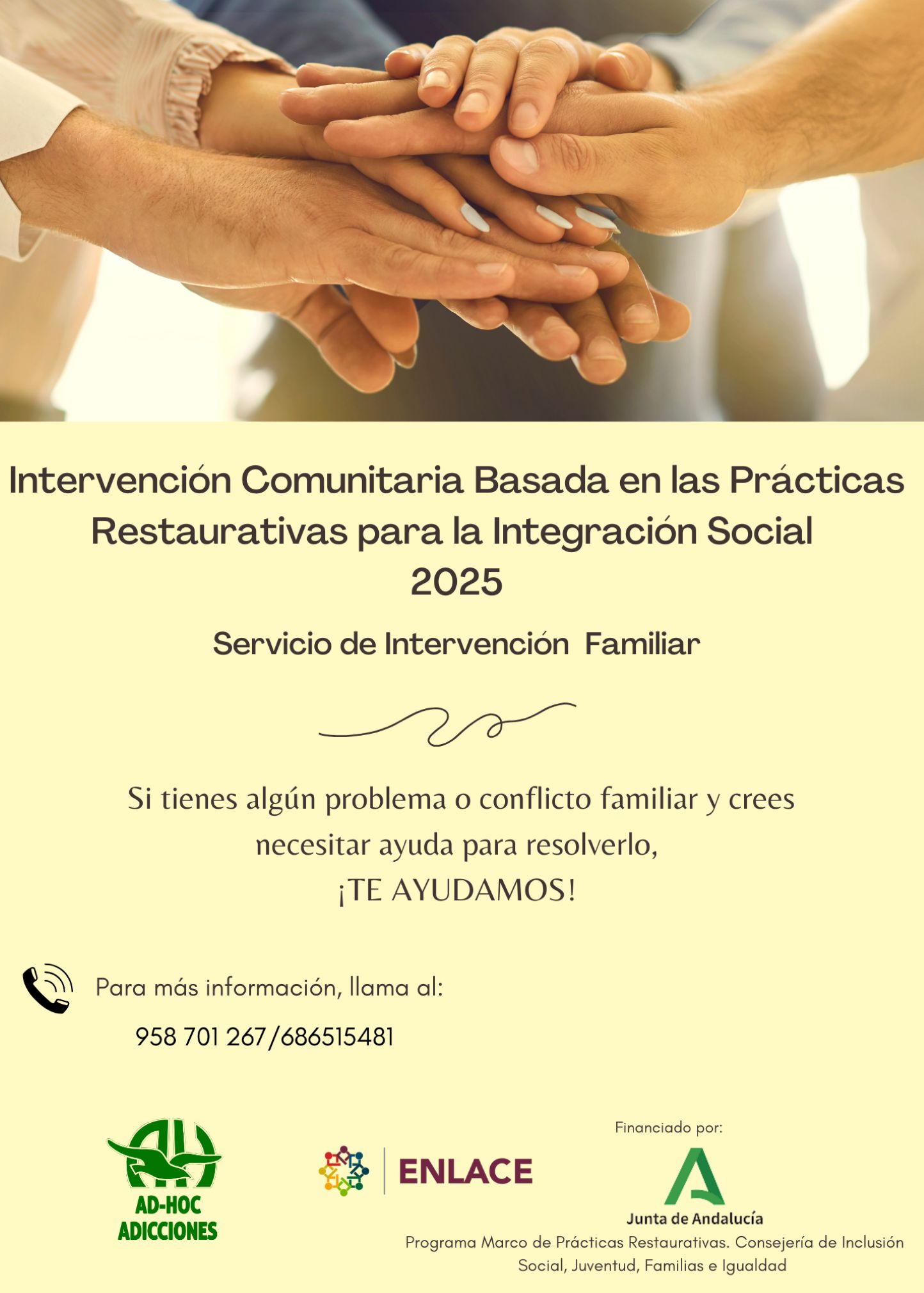 La Asociación Ad-Hoc desarrolla una intervención con familias en exclusión social y vulnerabilidad y el Programa Marco andaluz de intervención comunitaria basada en prácticas restaurativas para la integración social. La Asociación Ad-Hoc de Atención a Personas con Problemas de Adicciones está desarrollando el “Programa Marco andaluz de intervención comunitaria basada en las prácticas restaurativas para la integración social” subvencionado con cargo a la asignación tributaria del IRPF por la Consejería de Inclusión Social, Juventud, Familias e Igualdad y en colaboración con la Federación Andaluza ENLACE.