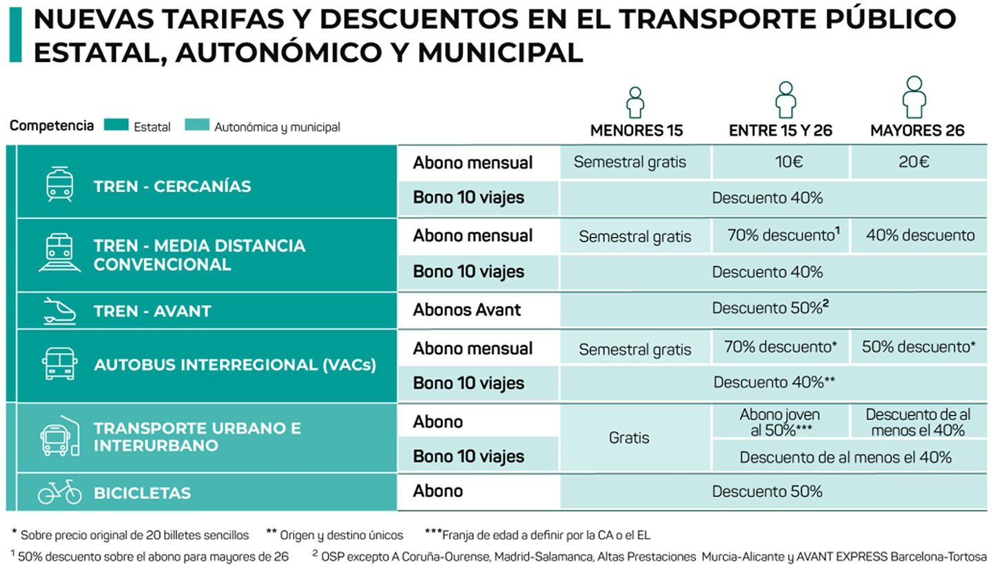 A nivel urbano e interurbano, el Ministerio destina 355 millones de euros para financiar la gratuidad de los menores de 15 años y aplicar un 50% de descuento en abonos para jóvenes, definidos por cada comunidad autónoma. El resto de títulos multiviaje contarán con un mínimo del 40% de rebaja, cofinanciada por el Estado y los gobiernos locales.
