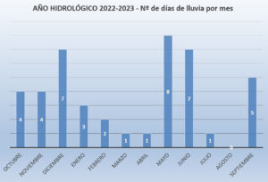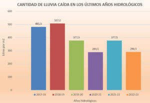 El año hidrológico que finalizaba con el mes de septiembre acabó casi igualándose al 2020-21 como el de menos lluvia caída en una cantidad bastante inferior a la del periodo 2017-19. El año hidrológico suele considerarse como tal en el periodo que se inicia con el mes de octubre y finaliza con el mes de septiembre, tiempo que en el último año hidrológico ha dejado un registro de 290,5 l/m2, cantidad muy similar a los 289,5 l/m2 del 2020-21 y lejos de los 507 l/m2 del 2018-19 o de los 481,5 l/m2 del 2017-18, mientras que el 2021-22 se queda en una cantidad intermedia de 377 l/m2.