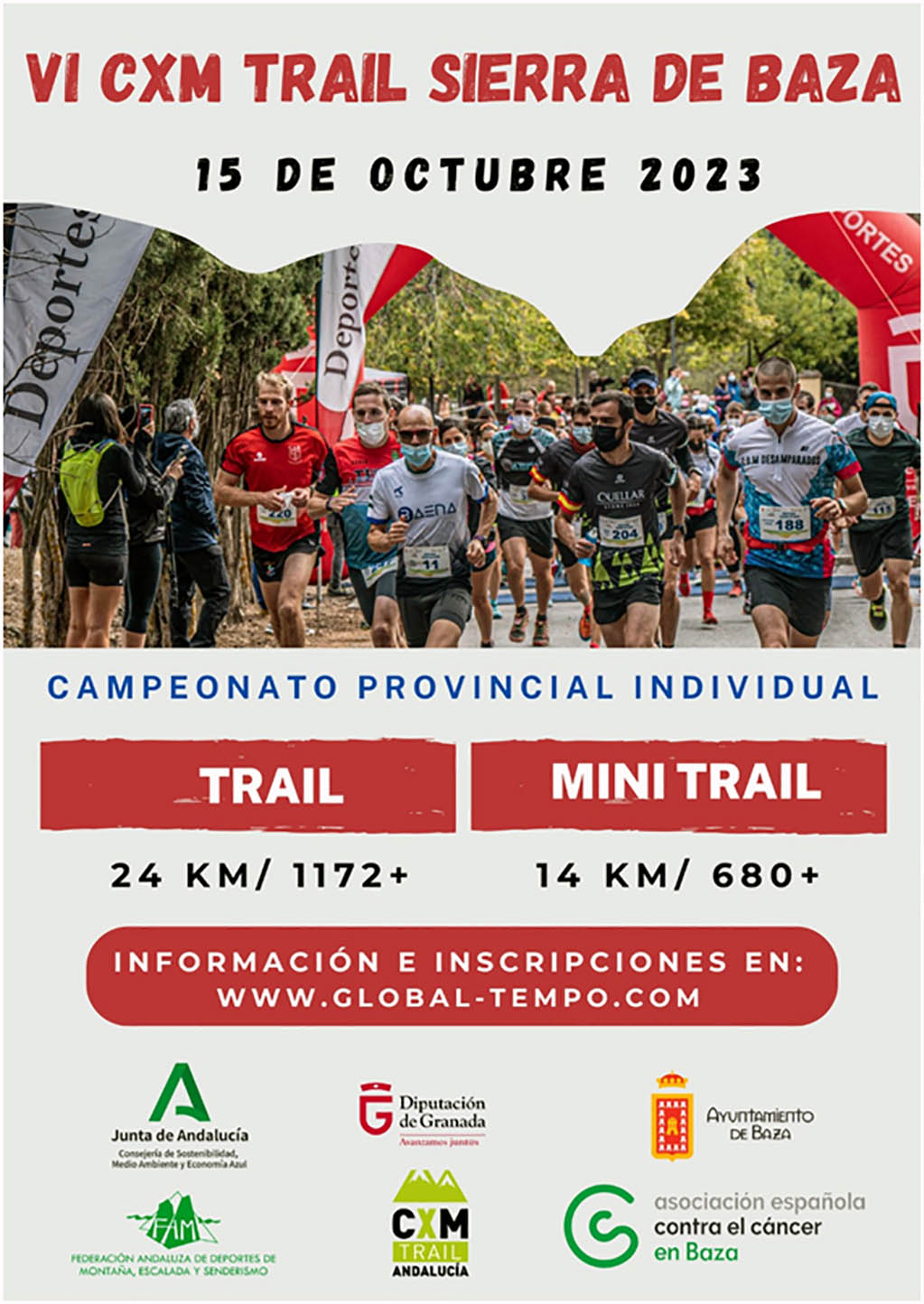 Para participar en ella es necesario inscribirse en la web www.global-tempo.com, donde también se puede obtener más información y más detalles de la prueba. Los participantes en el Trail tendrán que cubrir un recorrido de 24 kilómetros, con una variación positiva de 1.172 metros; en el caso del Minitrail, la segunda modalidad que incluye el evento, serán 14 kilómetros, con una variación de 680 metros. En la preparación de esta cita colaboran el Ayuntamiento de Baza, la Diputación provincial y la Junta de Andalucía, así como la Federación Andaluza de Deportes de Montaña, Escalada y Senderismo y la AECC.