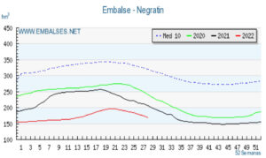 La situación de sequía determina un desembalse de 600 hm3 para el sistema de Regulación General en el año 2022, correspondiendo un volumen de 1.750 m3/ha, muy por debajo de los 5.000-6.000 m3/ha que venían siendo habituales hasta el año 2019.