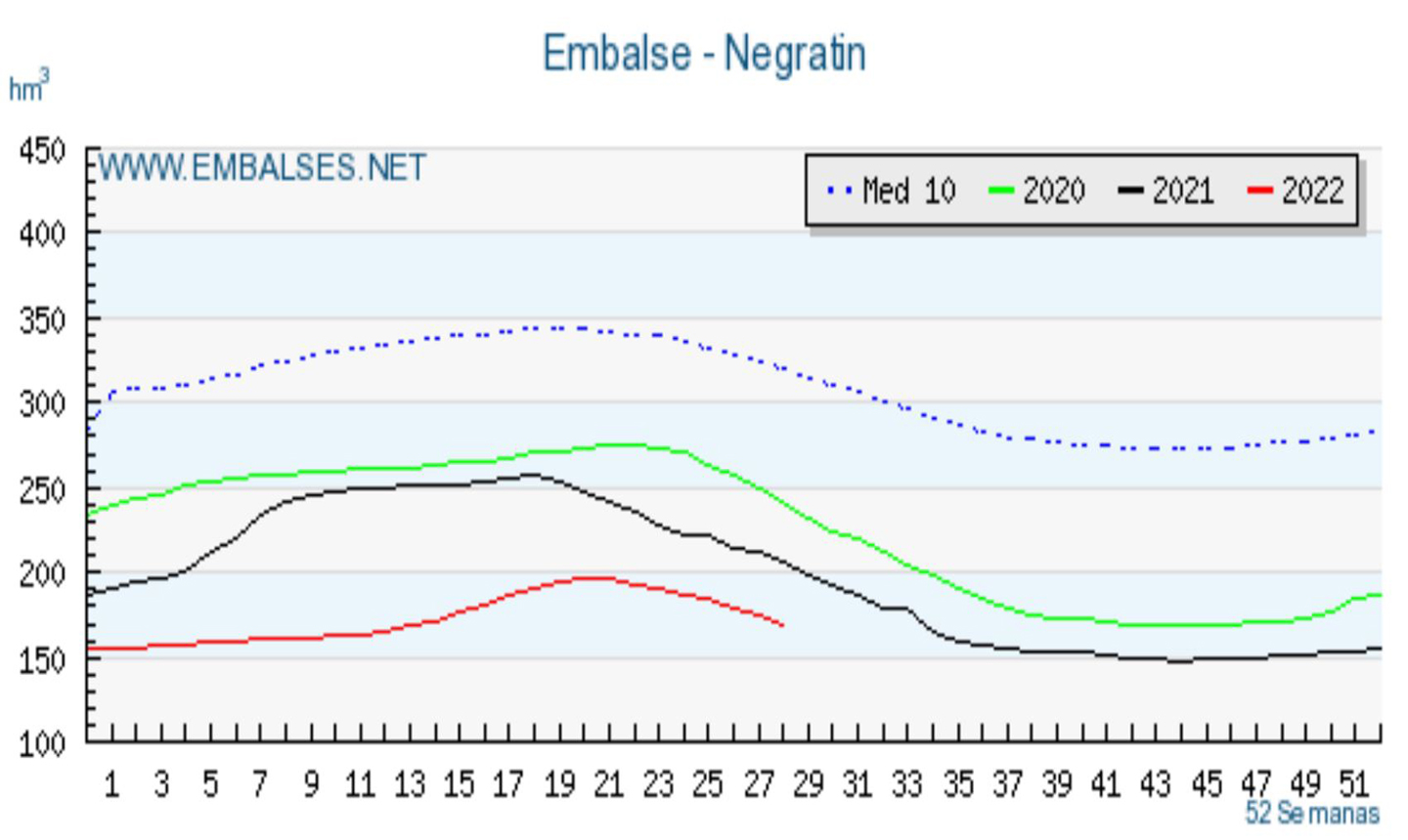 La situación de sequía determina un desembalse de 600 hm3 para el sistema de Regulación General en el año 2022, correspondiendo un volumen de 1.750 m3/ha, muy por debajo de los 5.000-6.000 m3/ha que venían siendo habituales hasta el año 2019.