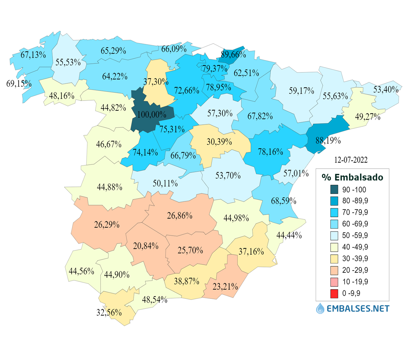 Y terminamos nuestro relato de la situación comparativa con los datos a nivel nacional, por los que hay 24.917 hm3 de agua embalsada, equivalentes al 44.39% de la capacidad de almacenamiento delos pantanos españoles, que es de 56.136 hm3.